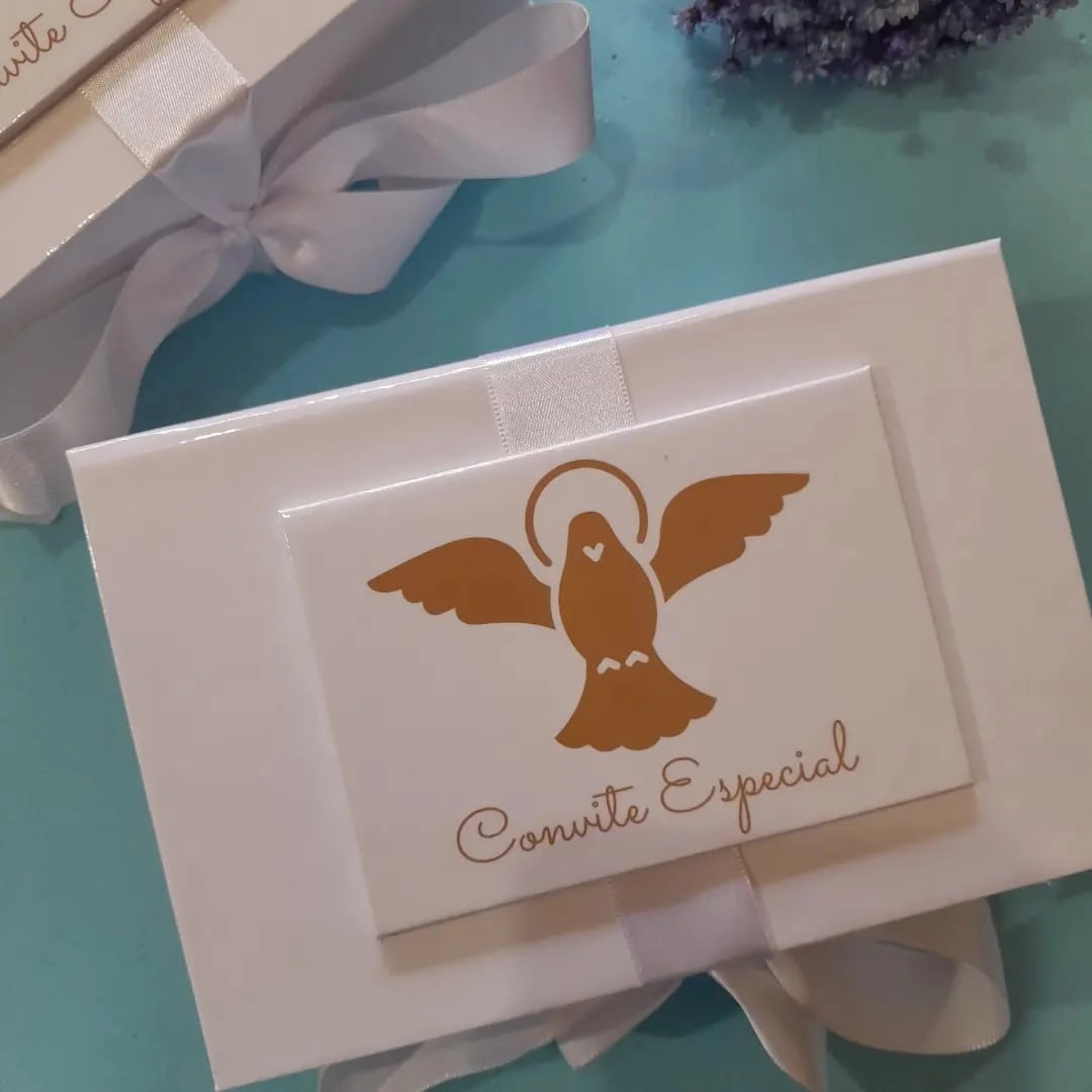 Tamanho da caixa 10x15cm e 5 cm ce altura a cor da fita pode ser trocada e cor do espírito santo tambem.
